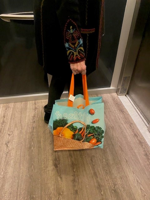 King Soopers is preparing its customers for the change by selling bags at its checkout stations. Better ones cost $5-6, but there’s one for 99 cents (shown here in Rita’s hand) that I’m keeping in my car so it’s not forgotten when I go shopping. Rita has been taking reusable shopping bags with her for months.